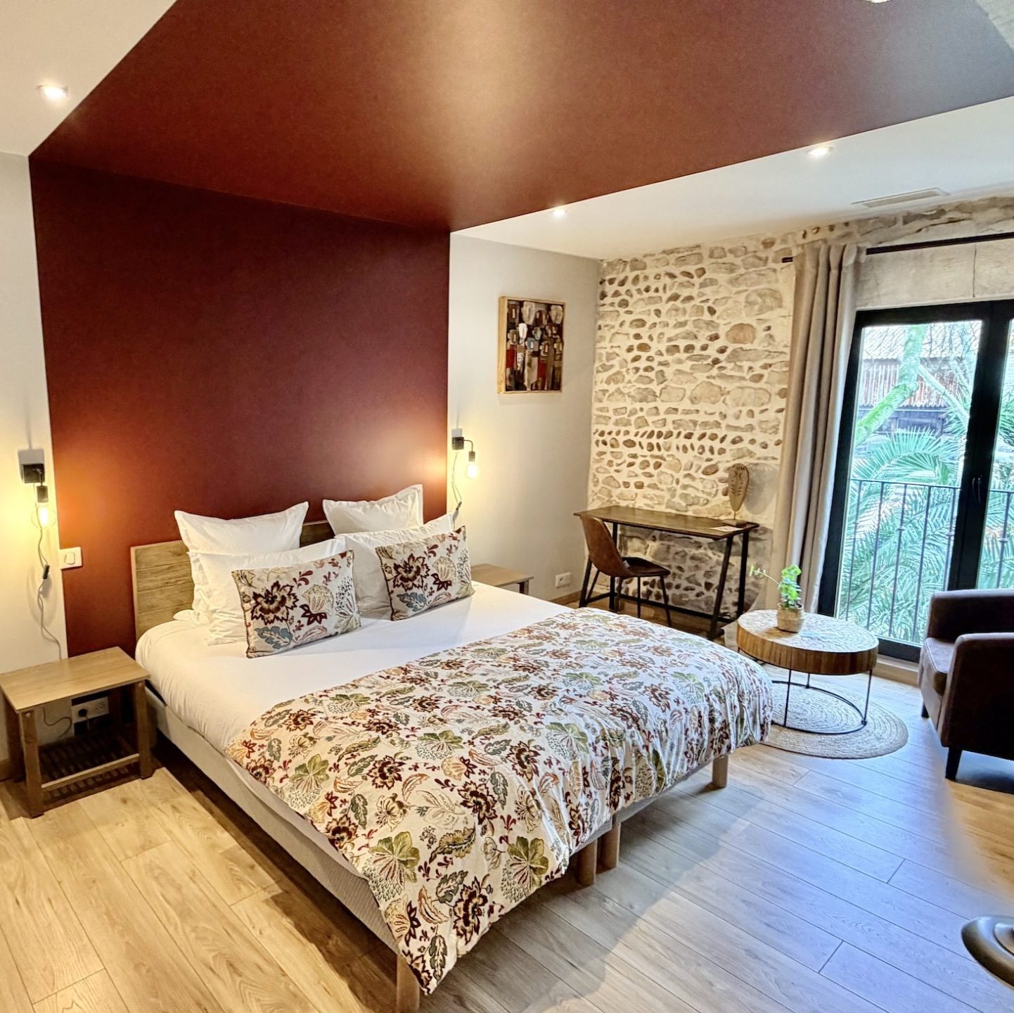 Chaque chambre a été pensée comme un cocon, inspiré par la lumière du Sud, le silence des pins, et l’élégance naturelle de l’ancien Mas de Galoffre. Pierres apparentes, matières brutes, mobilier chaleureux : l’authenticité est au rendez-vous.