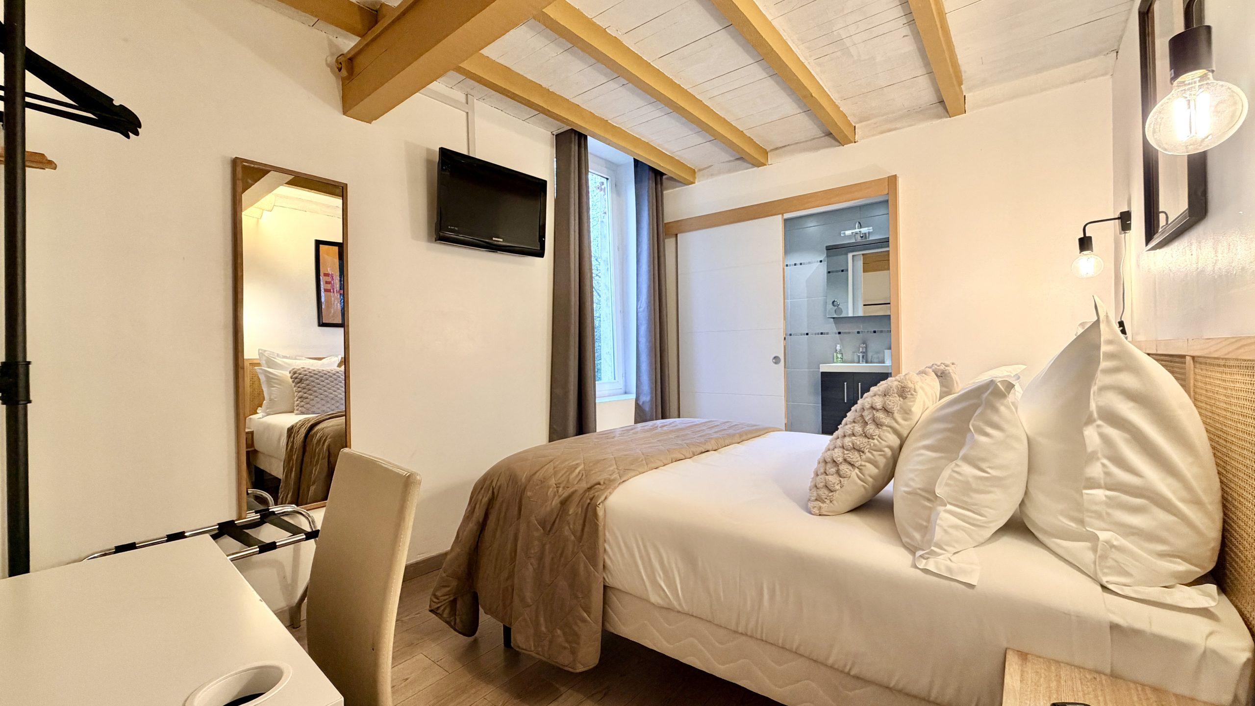 Autrefois lieux de vie pour des agriculteurs ou des jeunes du club sportif, les chambres de notre hôtel à Nîmes ont été entièrement rénovées pour offrir un confort moderne : climatisation, TV, Wi-Fi, salle de bain équipée, literie haut de gamme.